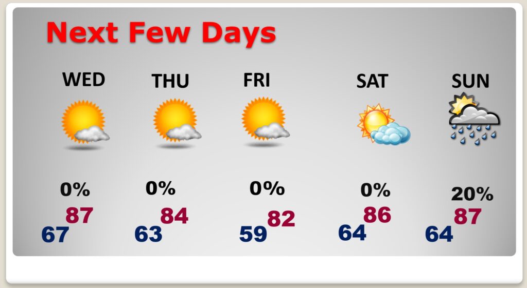 NEXT FEW DAYS: It’s still a quiet forecast. Sunny days. Mainly clear nights. Still mainly dry through Saturday. Highs mostly in the upper 80’s. Low mainly in the middle 60’s. A little cooler late week. Isolated showers could return on Sunday.