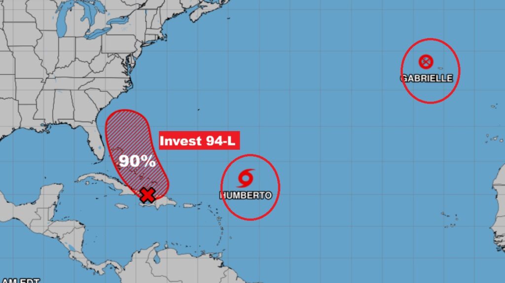 In front of Humberto, Invest 94-L, with an 90% chance of development could become a Depression later today as it approaches the SE Bahamas.  Eventually this system will get the name Imelda and will likely threaten the SE US.  NHC says: