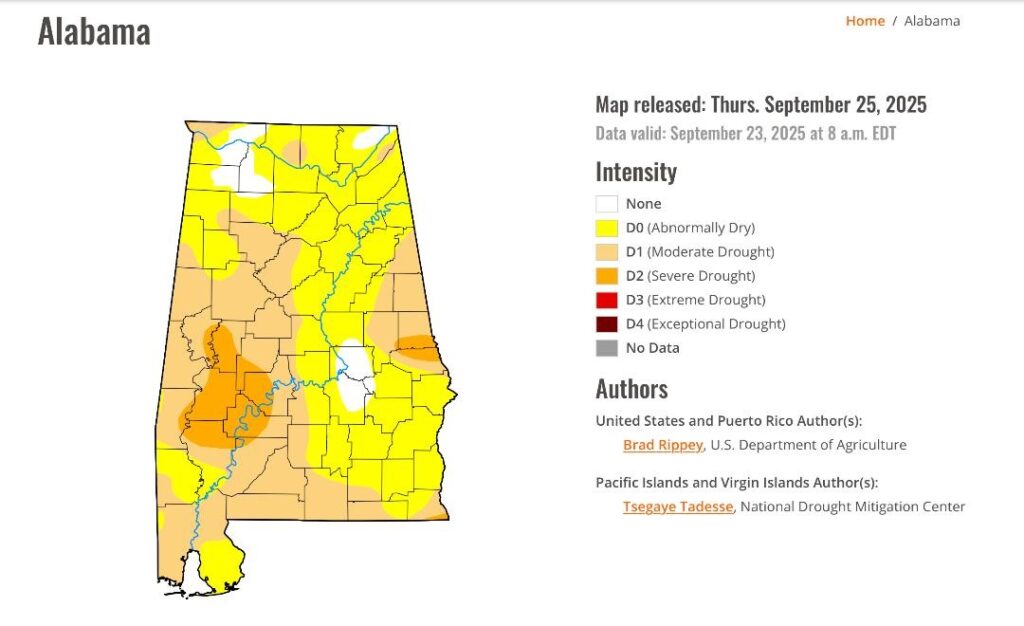 DROUGHT MONITOR:   Here’s the new drought monitor map, which comes out every Thursday. (Based on data through Tuesday). Not good. 95% of our state has some level of drought. 46% moderate drought or higher. Even severe drought in spots in west and East Central Alabama.