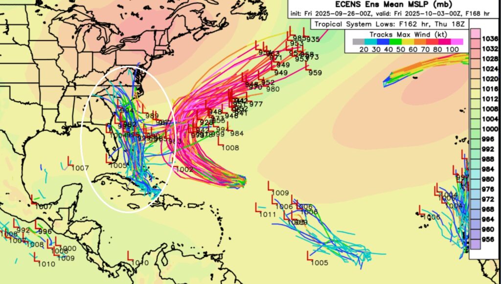 The EURO model Ensembles Member Lows Map indicate potential trouble for the Southeastern US Coastline.  So far, the biggest potential  US threat of the season.