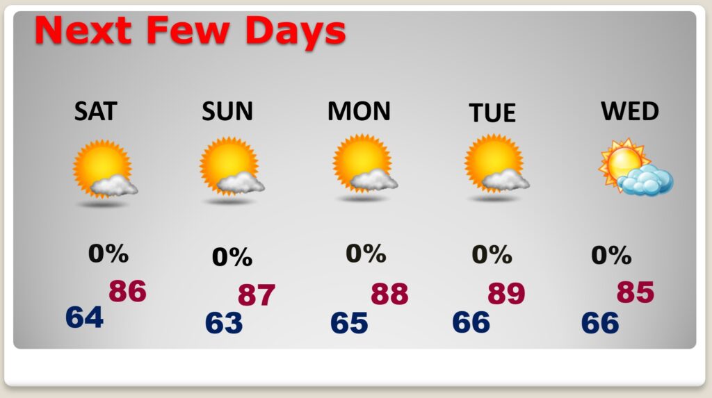NEXT FEW DAYS:  By tonight and over the weekend expect lower humidity and much nicer air.  Highs over the weekend will be in the 80’s with cooler low to mid 60’s at night.  Drey weather will dominate the forecast through mid-week.