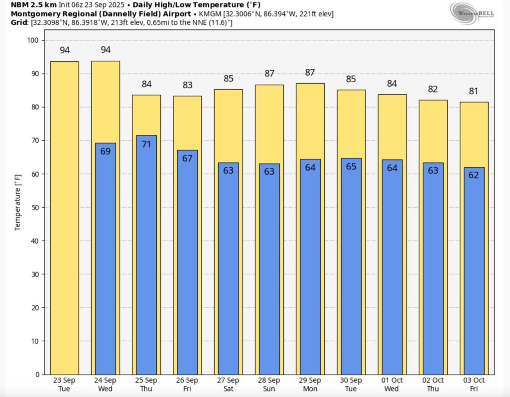 Here’s the 10 Day Temperature Trend. The 90’s are likely through Wednesday. But this week’s cool front will bring a nice change by the end of the week. The first weekend of Fall will feature much lower humidity and cooler nights.