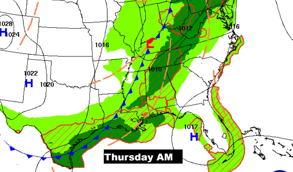 Showers and storms will likely be widespread by Thursday ahead of the front.