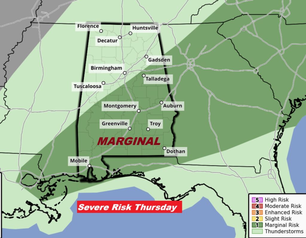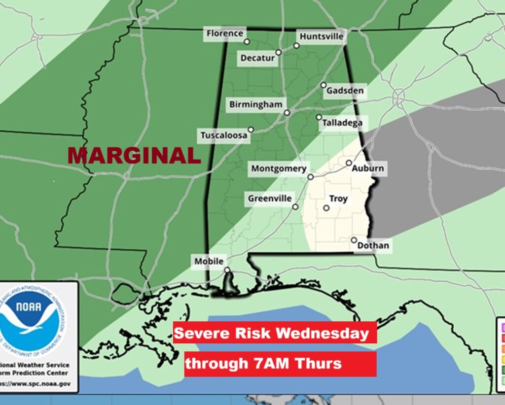 Some of the storms could reach severe limits by pre-dawn Thursday from Selma westward. Then, tyhe Marginal Risk spreads over the rest of the state Thursday.