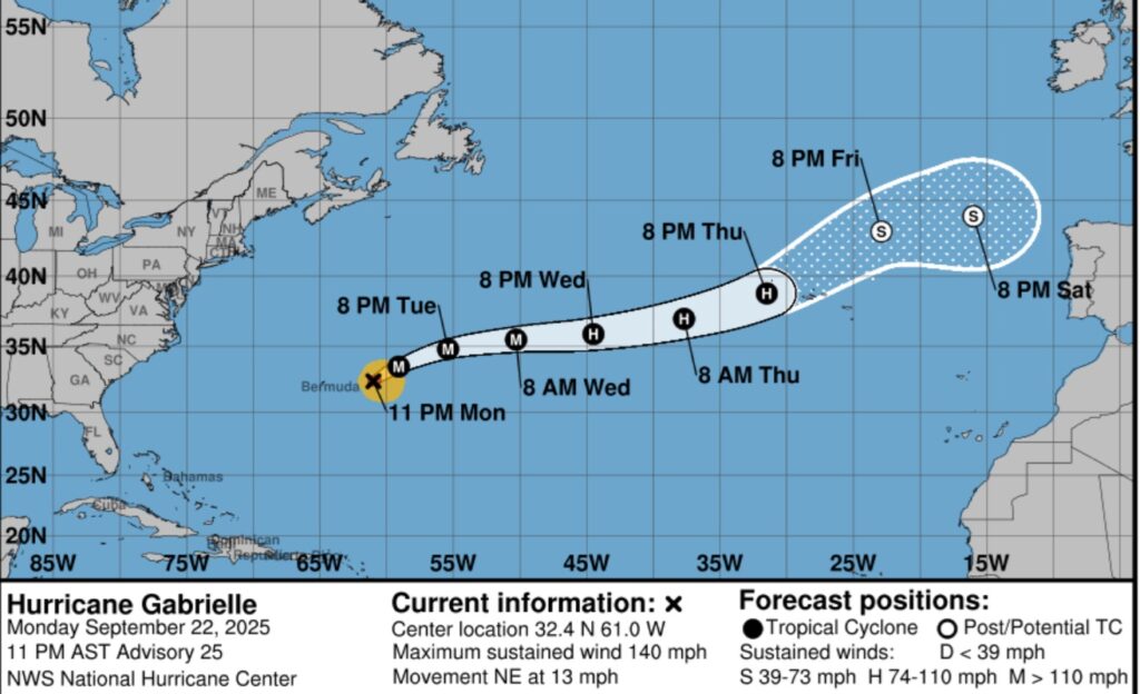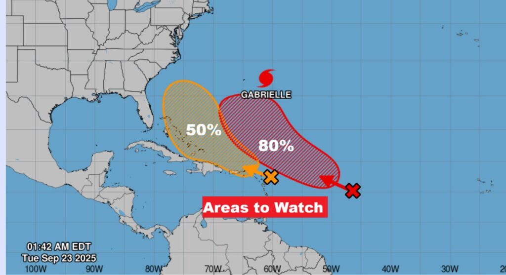 TROPICAL OUTLOOK: Gabrielle is a major Cat 4 hurricane in the open Atlantic. Is a not a threat to land areas at this time.