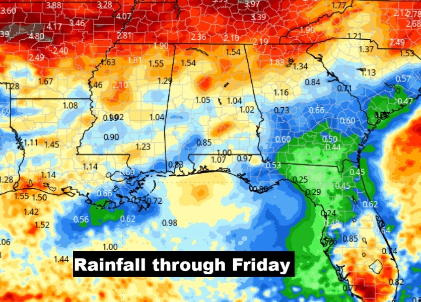 Here’s the projected rainfall through thew next 7 days. The approaching cool front will bring widespread showers and storms late Wednesday night and Thursday. Hopefully some substantial rainfall for many towns. MGM has only had .02” inn the last 26 days.