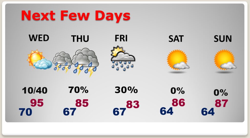 TODAY: Mostly sunny. A little more humid. Rain chance under 20%. High in the low to mid 90’s. Mostly clear tonight. Low upper 60’s to near 70.