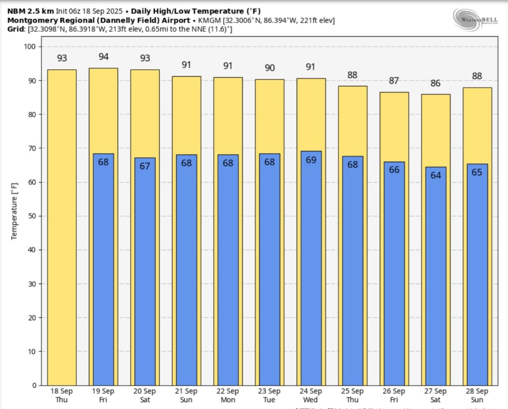 Here’s the 10 Day Temperature Trend.  Fall may begin Monday, but summer warmth will hang on.