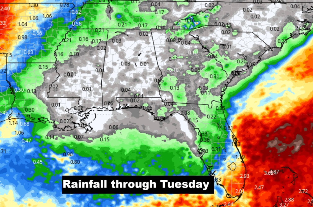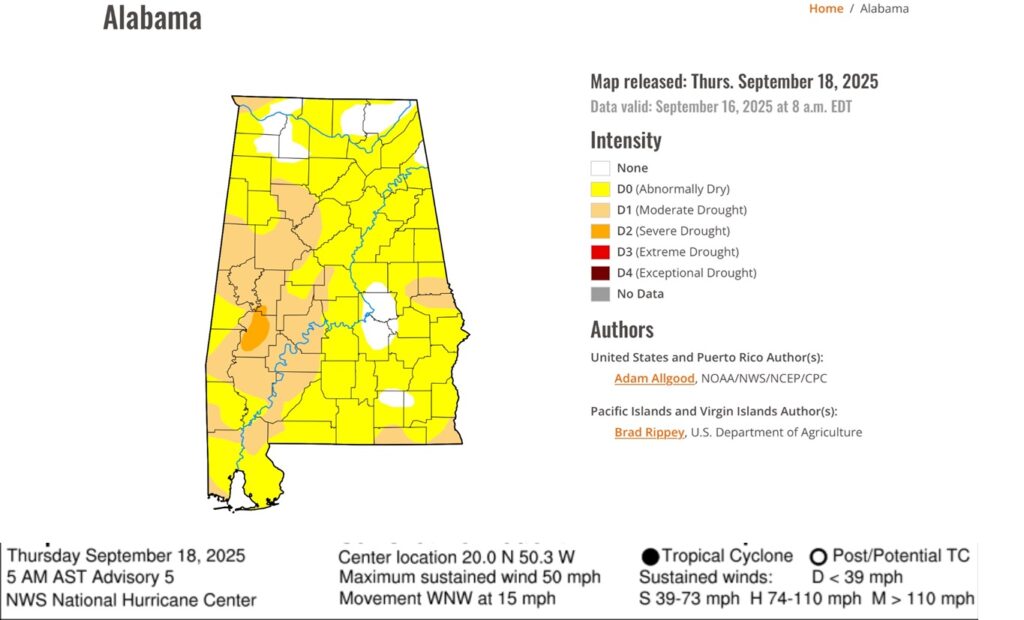 DROUGHT MONITOR: A big escalation in the dryness on the new drought monitor map just released. No 91% of the state has some degree of dryness that’s up from 49% last week. 28% of the state is in a moderate drought. And there’s even a tiny amount of severe drought in West Alabama.. the rain prospects are still not great. Generally 20% or less most of the next several days as far as probabilities.