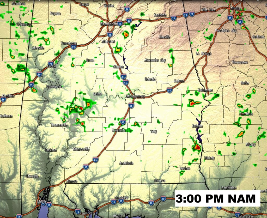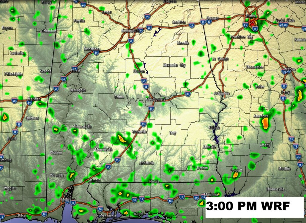 FUTURE RADAR:   Like yesterday, there could be some spotty showers on the radar…but here’s two hi-res models at 3:00PM.  You get the idea.  NOT MUCH.  Rain chance generally under 20%.