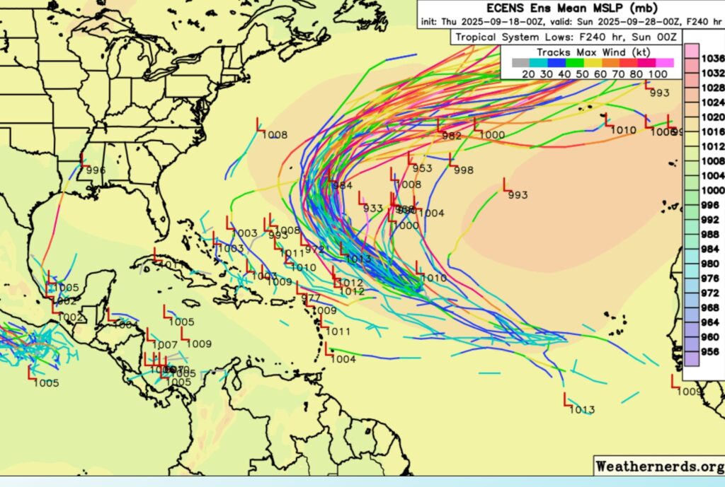 Here’s the EURO Ensemble Member Lows  outlook through the next 10 days.  Right now, the central Atlantic looks like a hot bed.  We also notice The Bahamas and the Gulf, too.