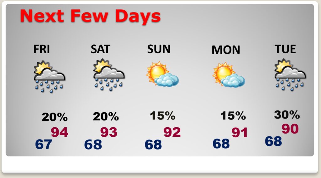 Good morning!  It’s still hot, and gradually it’s getting more humid. We’ll be in the low to mid 90’s for the next few days. Combined with dewpoints in the mid and upper 60’s it will feel rather steamy, right on through the last official weekend of Summer and beyond.  There were a few spotty showers on the radar yesterday, and again today and for the next few days, isolated showers are not out of the question. But, each day the rain chance will be generally 20% or less.  Here’s my brief video forecast discussion.