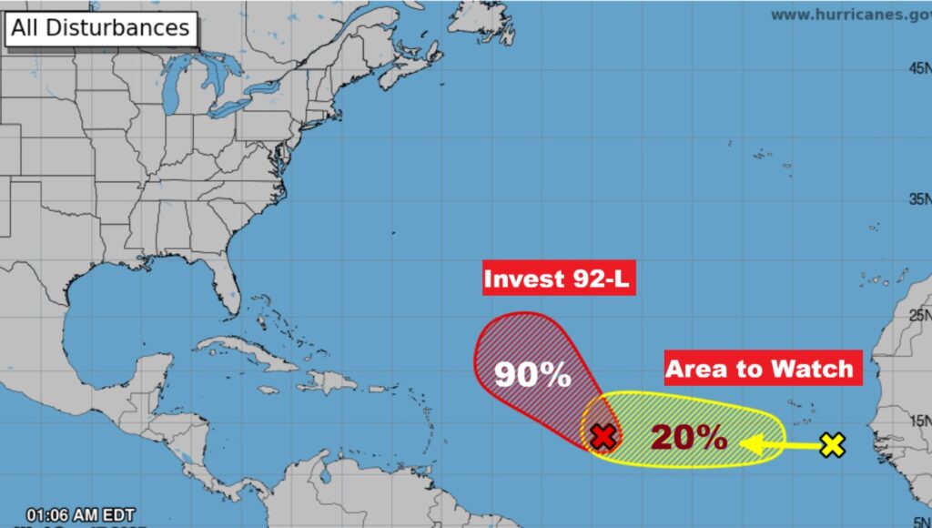 TROPICAL OUTLOOK:  Invest 92-L in the Tropical Atlantic  has a 90% chance of development.  It’s expected to become a tropical depression maybe today, and then very likely tropical storm Gabrielle.