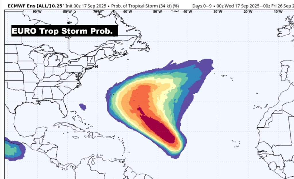 Here’s what the EURO says about the next 10 days.  There is a high probability of a Tropical storm.  Almost certainly.
