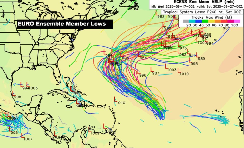 Here’s the EURO Ensemble Member Lows  outlook through the next 10 days.  Right now, the central Atlantic looks like a hot bed.  We also notice The Bahamas and the Gulf, too.
