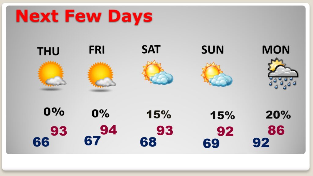 NEXT FEW DAYS:   Hot Dry days will continue.   The 90+ forecast continues through at least early next week if not longer.  It’s not out of the question we could see some isolated showers or thundershowers over the Sunday through Tuesday, but chances are very remote.  The nights are comfortable in the 60’s.