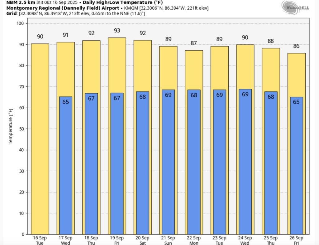 Good morning! The seemingly endless hot and very dry September pattern continues. There has been no measurable rain at the airport in the last 19 days. We have been 90+ for 11 days straight. The 90+ forecast continues through at least Sunday, if not longer. It’s possible we may see some isolated showers or thundershowers over the weekend, but don’t bet the farm. Basically, we will be storm-free for several more days. Here’s my brief video forecast discussion.