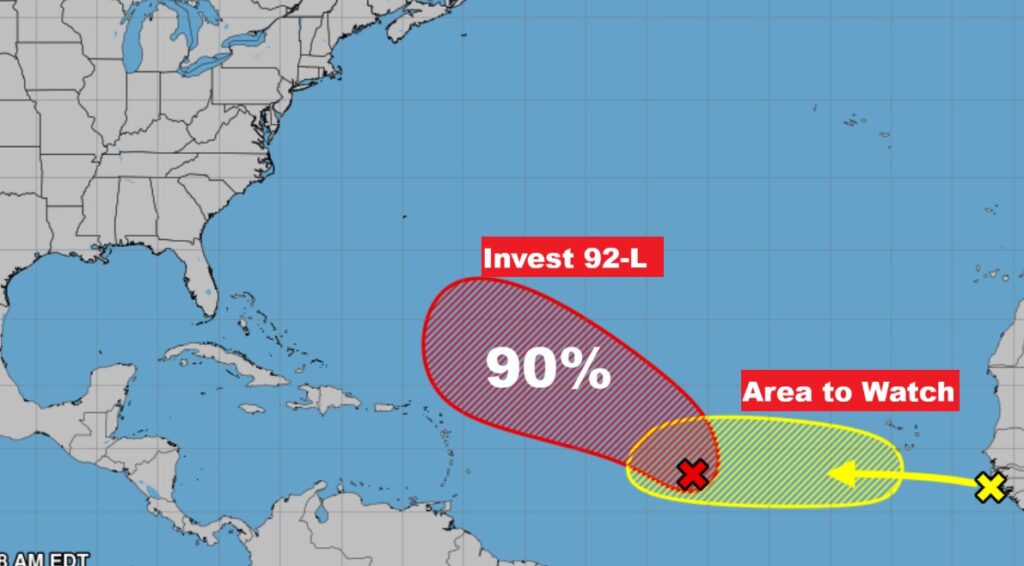 TROPICAL OUTLOOK: Invest 92-L in the Tropical Atlantic now has a 90% chance of development. It’s expected to become a tropical depression soon, and then very likely tropical storm Gabrielle.