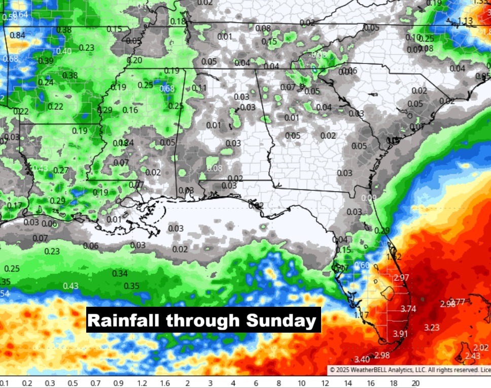 Here’s the projected rainfall through Sunday. Isolated weekend showers?