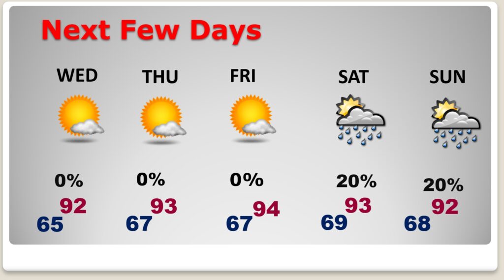 NEXT FEW DAYS: Hot Dry days will continue. The 90+ forecast continues through at least Sunday, if not longer. It’s possible we may see some isolated showers or thundershowers over the weekend, The nights are comfortable in the 60’s. Fortunately, humidity is still fairly tolerable. s.