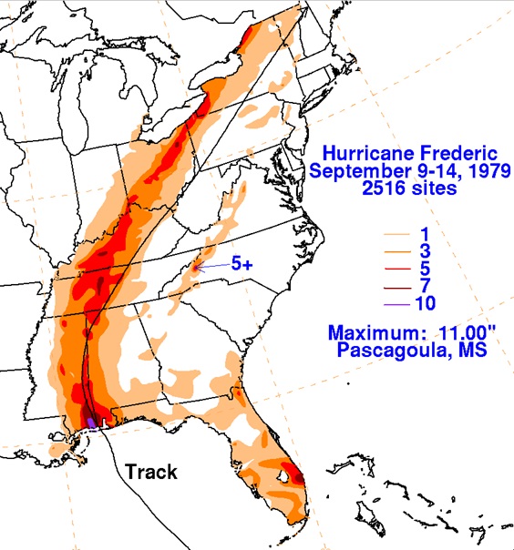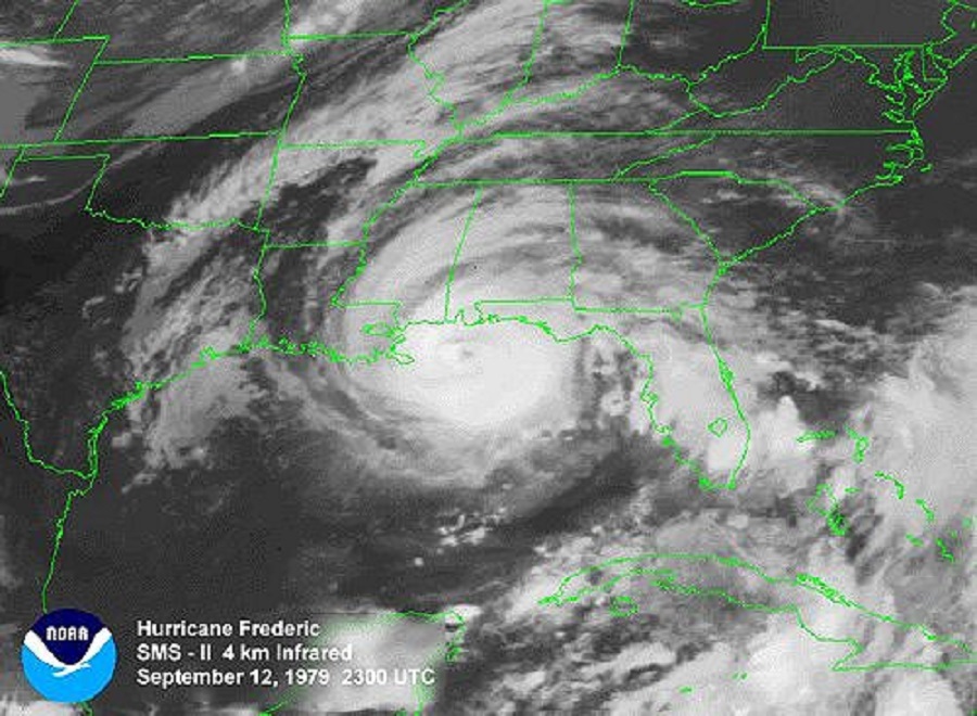 HURRICANE HISTORY: On this date in 1979 Hurricane Frederic devastated the Alabama Gulf Coast – making landfall at Dauphin Island. At landfall, Frederic was a Category 4 on the Saffir-Simpson Hurricane Intensity Scale, raking the Mobile Bay area with winds gusting from 100-145 mph for several hours on the evening of September 12 through the early morning of September 13, then tracking northward through West Alabama causing incredible damage. 1979 was the first year that male names were used for tropical systems.
