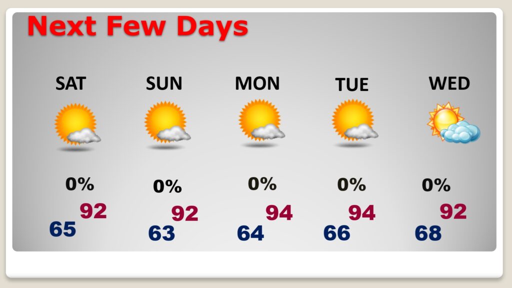 Good morning! Gradually we’re getting hotter again. Thursday’s high was 90. (Normal hi/lo 91/68) Expect lower 90’s today through Monday, and low to mid 90’s by Tuesday. Fortunately, humidity is still very tolerable, and the nights are comfortably cool. I see no storm systems in the next several days. NHC is monitoring an Area to Watch in the far eastern Tropical Atlantic, with a 40% chance of development. Here’s my brief video forecast discussion.