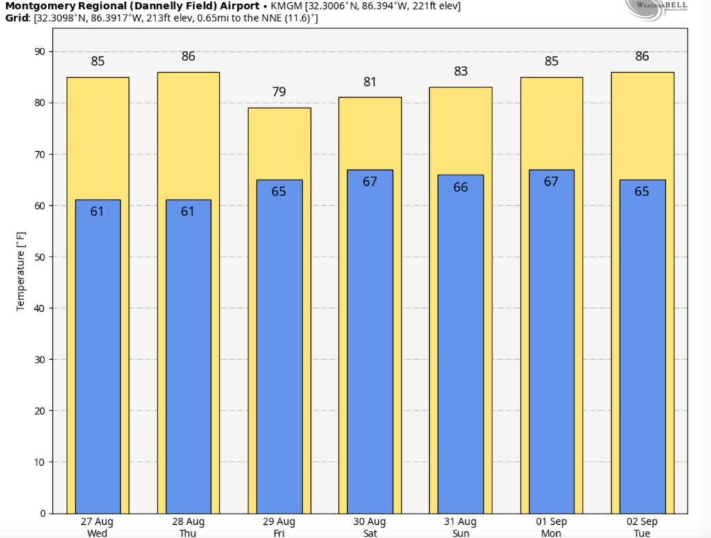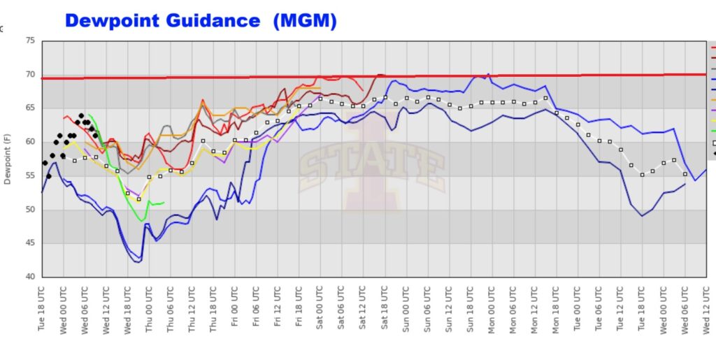 What’s called “False Fall” Continues. And, the key to our comfort is those much lower dewpoints. Late yesterday afternoon the dewpoint fell to 55. Today, models suggest we could see upper 40’s dewpoints. Feels great! But, UH OH. Look at what happens to the dewpoint this weekend. False Fall will end too soon. #alwx