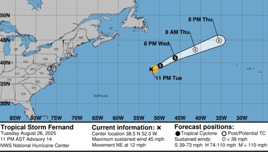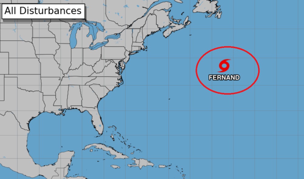 FERNAND is a 45 mph “fish Tropical storm” in the middle of the Atlantic.