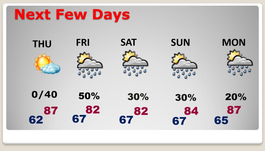 Good morning! What’s called “False Fall” continues, and it feels great. We’re enjoying nice string of comfortable days and pleasantly cool nights. Highs will be in the middle 80’s again today and Thursday. Low at night in the lower 60’s will feel great. We’ll be dry at least through Thursday evening, with partly cloudy days and cool nights. The next chance of showers and storms begins late Thursday night and Friday as a disturbance moves across the state. Expect more random scattered storms over the Labor Day weekend. Not a washout. Highs in the mid 80’s. Here’s my brief forecast discussion.