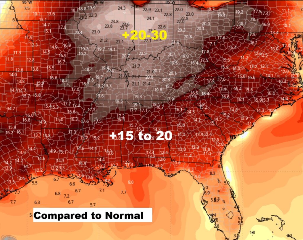 Highs will be running 15 to 20 degrees above normal later in the week. Even warmer than that in the Midwest and Great Lakes.