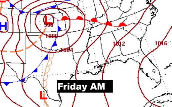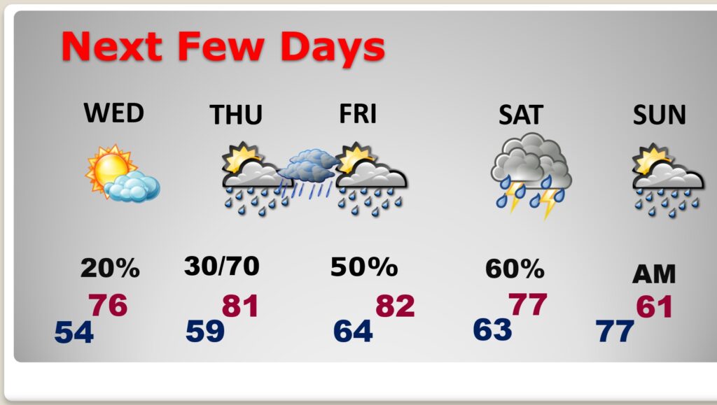 The risk for widely scattered showers begins Wednesday night, becoming more likely Thursday and Friday. Showers and thunderstorms are expected Saturday ahead of a cool front that will substantially lower temperatures by Sunday and especially Monday. Here’s my video forecast discussion.