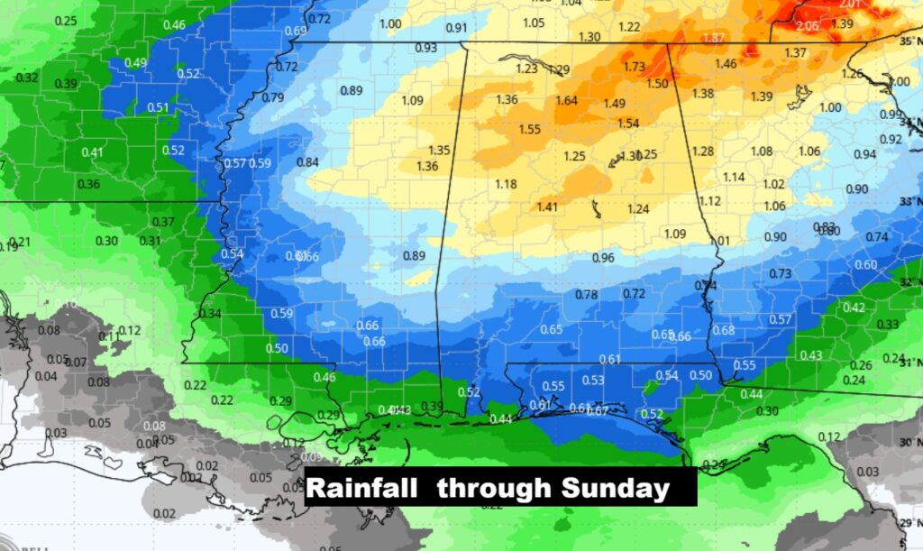 Here’s the expected rainfall through Sunday. Heaviest in North Alabama.