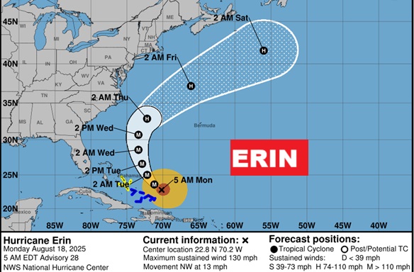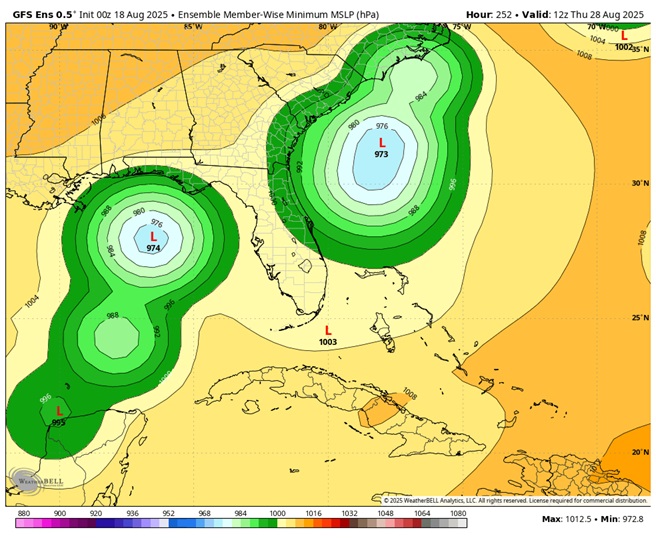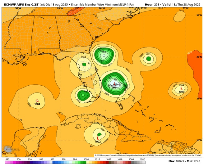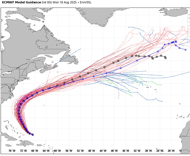 Here’s the EURO Ensembles –all showing Erin will likely miss the US and turn into the open Atlantic.  However, significant wave action and rip currents will affect the Bahamas and  US East Coast, particularly the Carolinas.