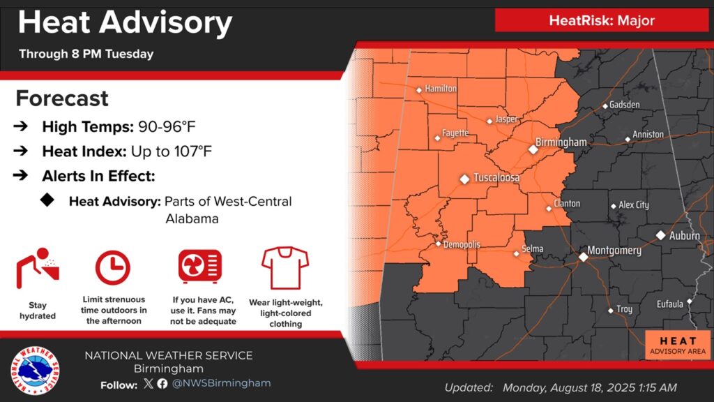 That mound of upper level high pressure is in firm control. A heat Advisory covers much of western Alabama, west of a Clanton/Selma line and also covers a multi-state area.