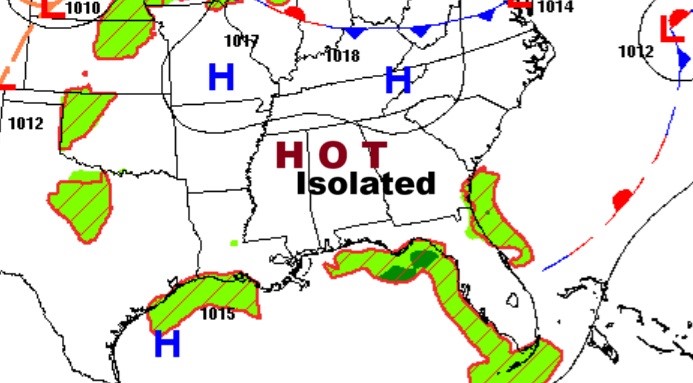 NEXT FEW DAYS:   The number of storms will be very isolated in nature each of the next few days. Rain chances will get a little better by the end of the week.   Expect more dangerous hot days. Highs in the mid 90’s through Thursday.  Temperatures will be more reasonable by the weekend and beyond.  High temperatures will stay below 90.