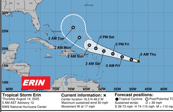 Good morning! Yesterday – radar was on fire with showers & storms. Today will be much more routine. Fewer random PM showers and storms will drench a few towns. The trend will be for only isolated to widely scattered storms Friday, through the weekend and early next week. With fewer storms and more sun, expect hotter days. We’ll be in the lower 90’s toady. Likely middle 90s Friday through early next week. Triple digit Heat Index will return. Tropical Storm Erin growing stronger is moving westward in the Tropical Atlantic. Erin could become a Hurricane by Thursday and very likely a Major Hurricane by this weekend. Erin is likely to turn into the open Atlantic and likely miss the United States all together. Here’s my brief video forecast discussion.