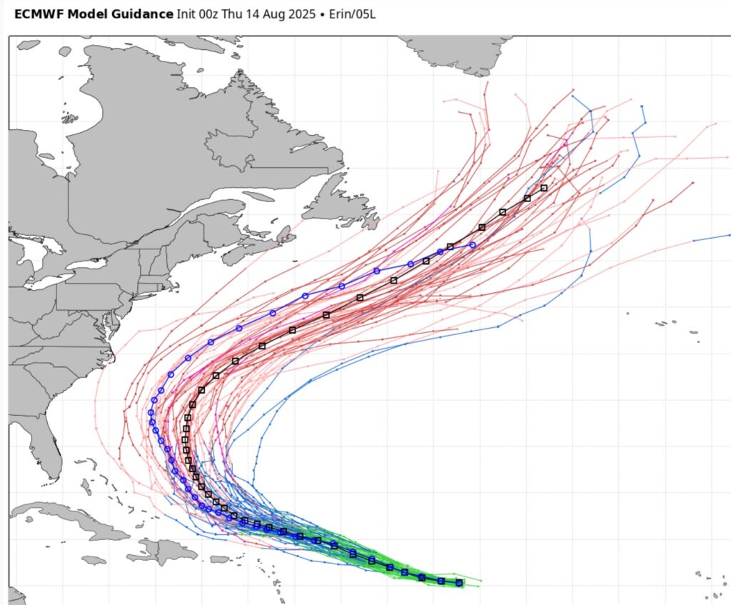 Here’s the EURO Ensembles –all showing Erin will likely miss the US and turn into the open Atlantic.