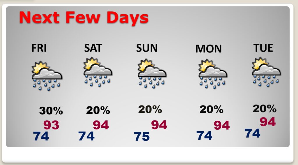 TODAY: Sun/cloud mix. High in the lower 90’s. Random scattered showers and storms most numerous in the after and evening hours. Low tonight 74