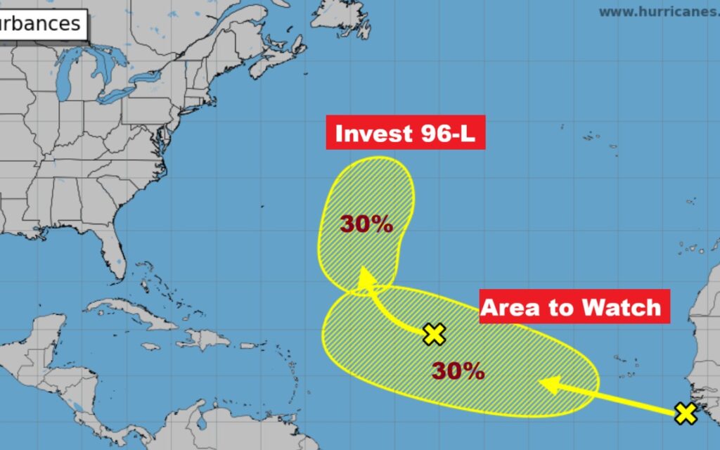 NHC: Invest 96-L, in the Tropical Atlantic now has a 30% chance of development.  Farther out, there’s another Area to Watch off the African coast with a 30% chance of development.