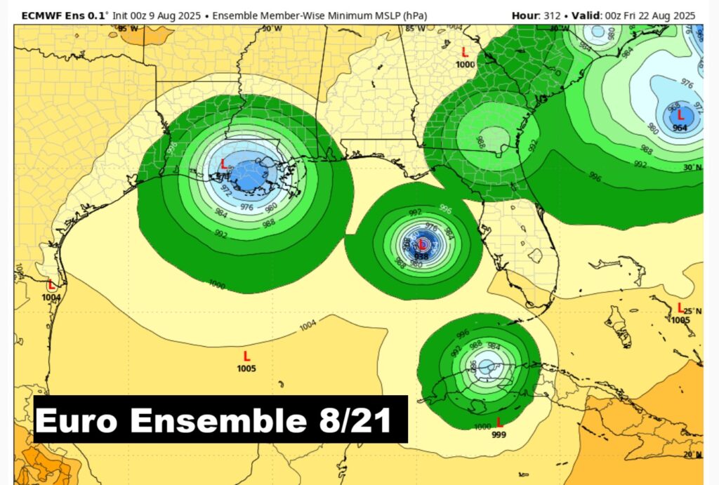 Later in the month, we’ll be closely watching possible tropical trouble close in the US – in the Gulf and off the SE coast. This is a couple of weeks in the future on the Euro.