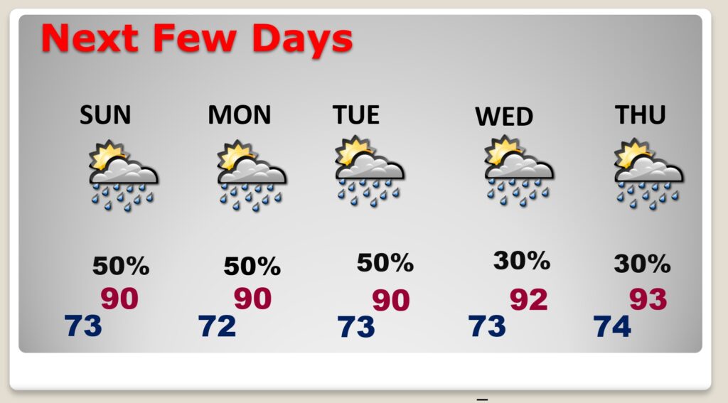 NEXT FEW DAYS:   Routine forecast.  Scattered mostly PM showers and storms each day,  a little more numerous Sunday and Monday.  Highs Near 90 Sunday through Tuesday. Then, low to mid 90’s by mid-week.
