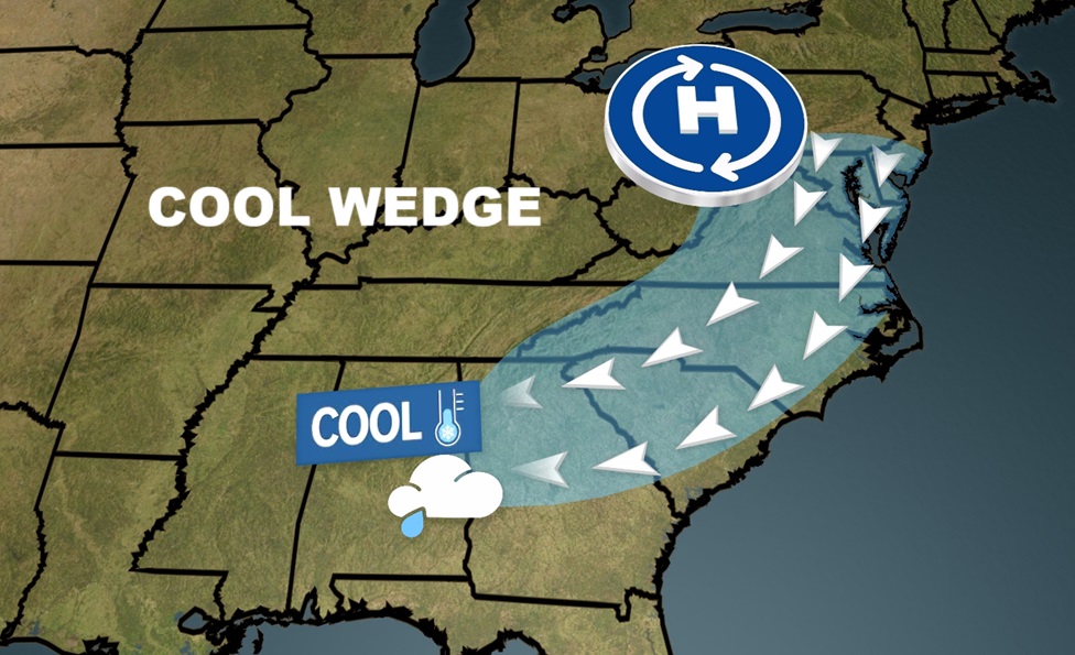 COOL WEDGE: The combination of high pressure of high pressure along the east coast will continue to allow a northeasterly wind flow which will send some much cooler air to migrate down the Appalachian Mountain chain into Alabama.Today will be the coolest day in Montgomery since last May 10th.