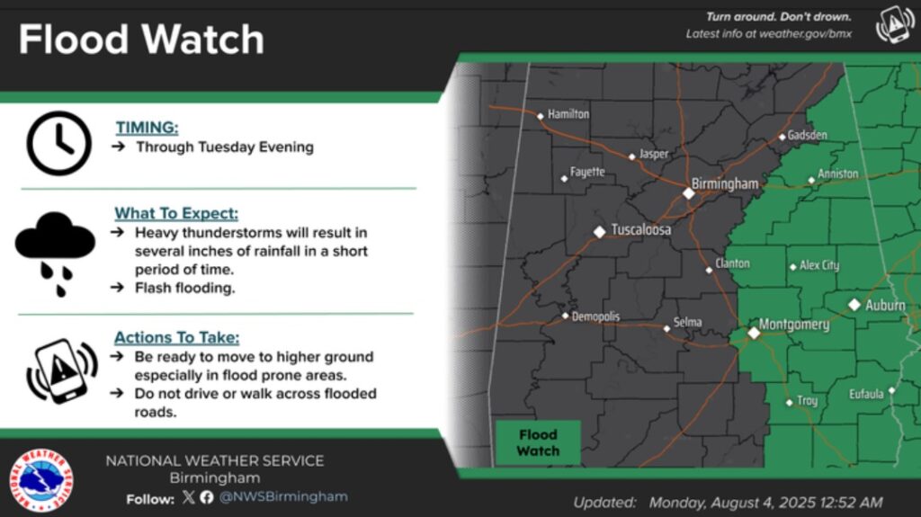 A Flood Watch Continues along and east of a Clanton/Montgomery/Troy line.