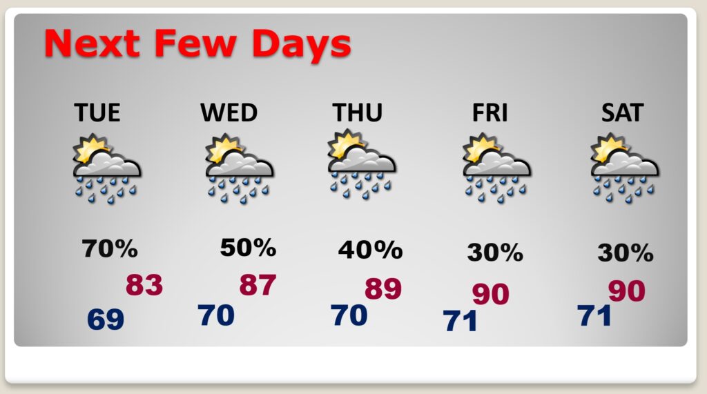 NEXT FEW DAYS: Scattered to numerous random storms are back in forecast each day this week. Highs only in the 80’s each day until perhaps Sunday. Amazing change.