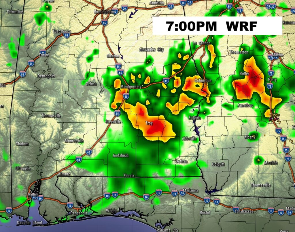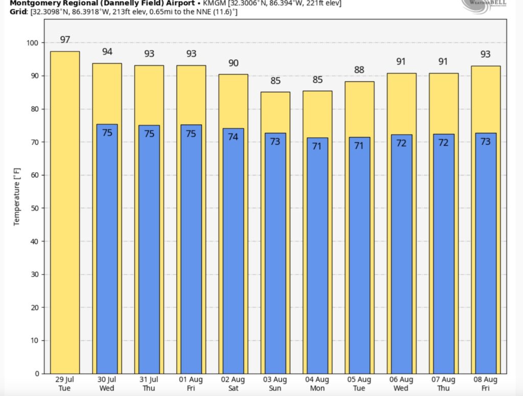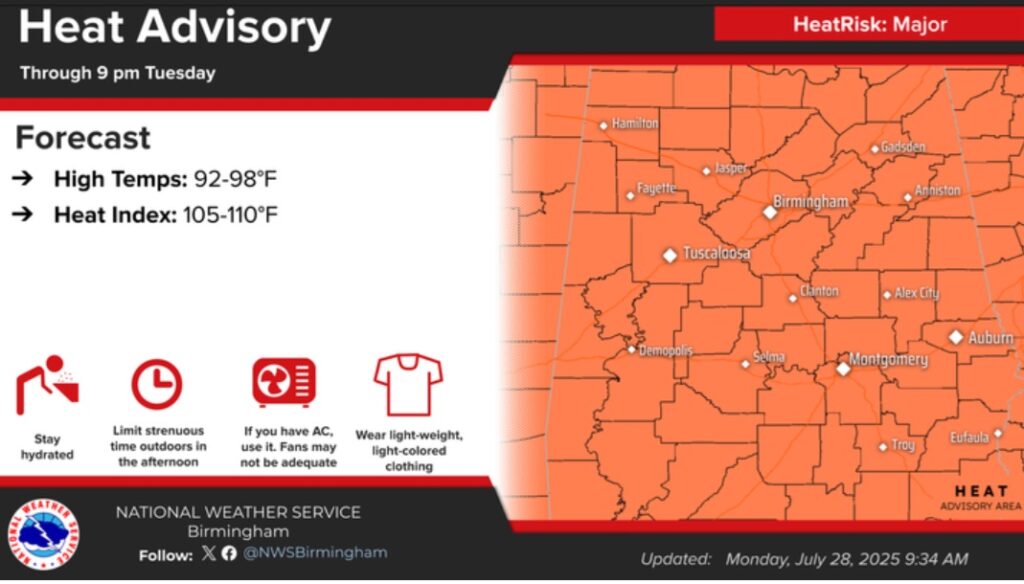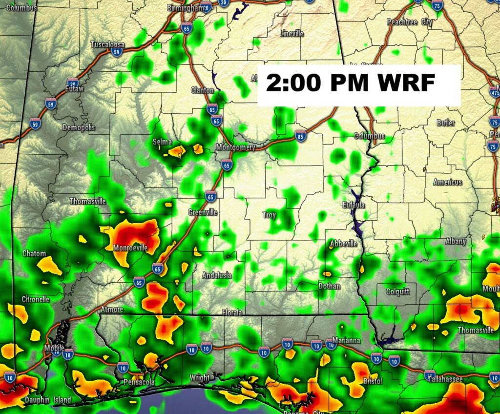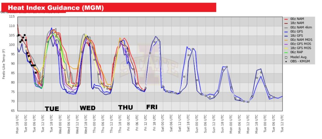 Good morning! Dangerous heat continues. A Heat Advisory continues in effect today. Heat index today will be in the dangerous 105-110 range. Radar will be much more active today through the rest of the week. Scattered to numerous random storms. A frontal system will enter the state by Friday night. Then the front stalls somewhere in south Alabama. So, the risk of scattered storms remains in the forecast this weekend. Eventually temperatures will be a little more reasonable with highs in the 80’s next Sunday through the following Tuesday. A positive move in the right direction. Here’s my brief video forecast discussion.