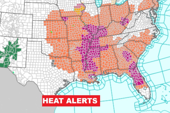 Widespread Heat Alerts cover a multi-state area under a Massive Upper Heat Dome, which is starting to migrate westward.