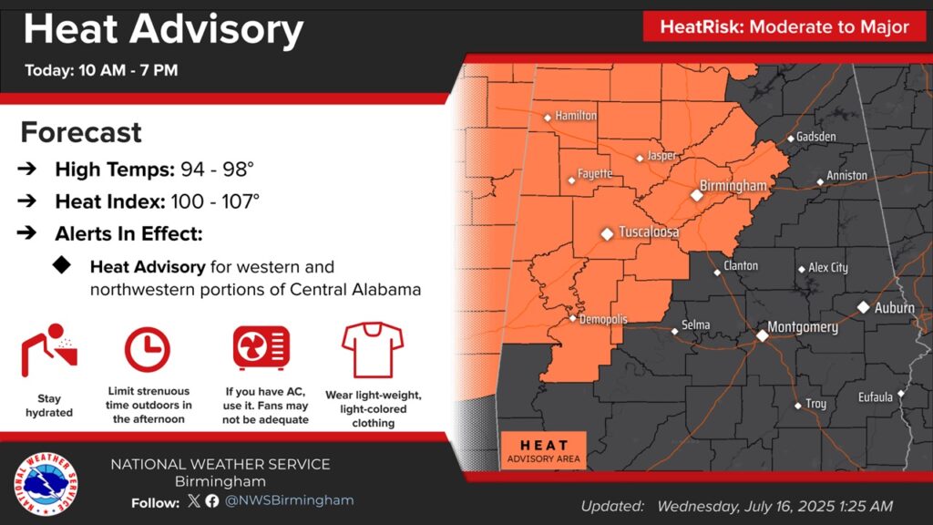 Parts of West Alabama are under a Heat Advisory today. This includes Birmingham and Tuscaloosa.