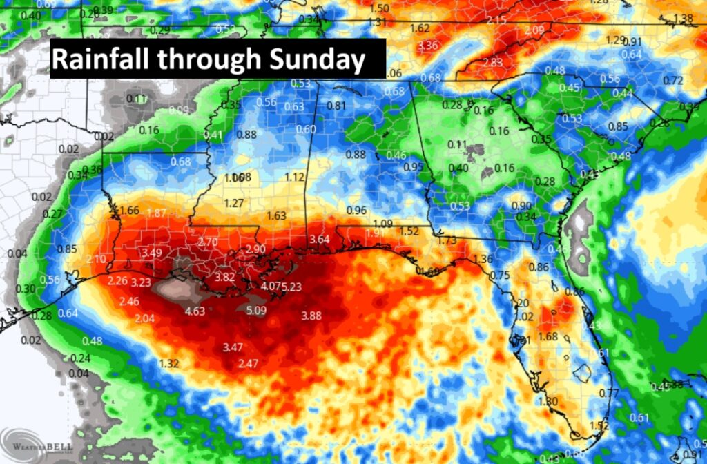 Drenching rains are expected from the Florida panhandle to the NE Texas Gulf Coast.