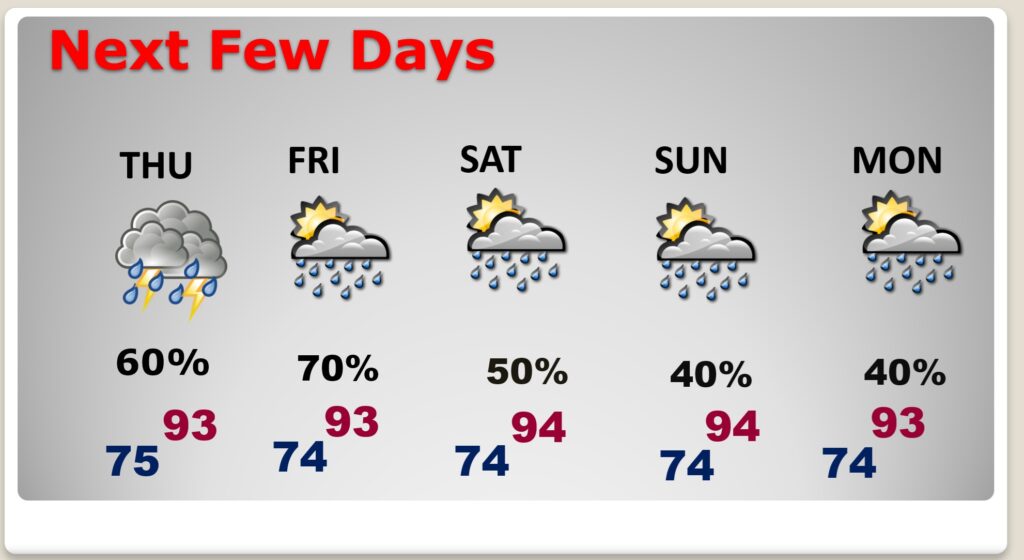 NEXT FEW DAYS: Random storms will be more numerous, especially Thursday and Friday, as we track the future movement of invest 93-L along the northern Gulf coast.  Expect low to mid 90’s daytime, and muggy 70’s at night.
