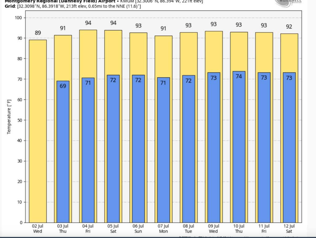 NEXT FEW DAYS: The front moving through the state today will deliver somewhat drier air. It’s generally a dry forecast Thursday through at least Saturday. Expect mid 90’s on the 4th of July and Saturday. Isolated storms return Sunday and scattered storms Monday.